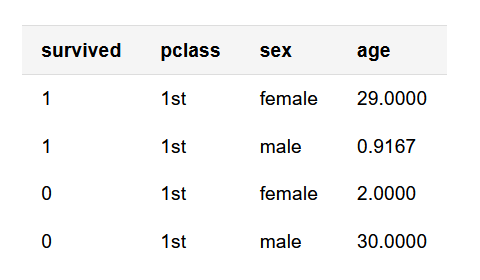 titanic3 <- titanic3[, c('survived', 'pclass', 'sex', 'age')] |> na.omit()